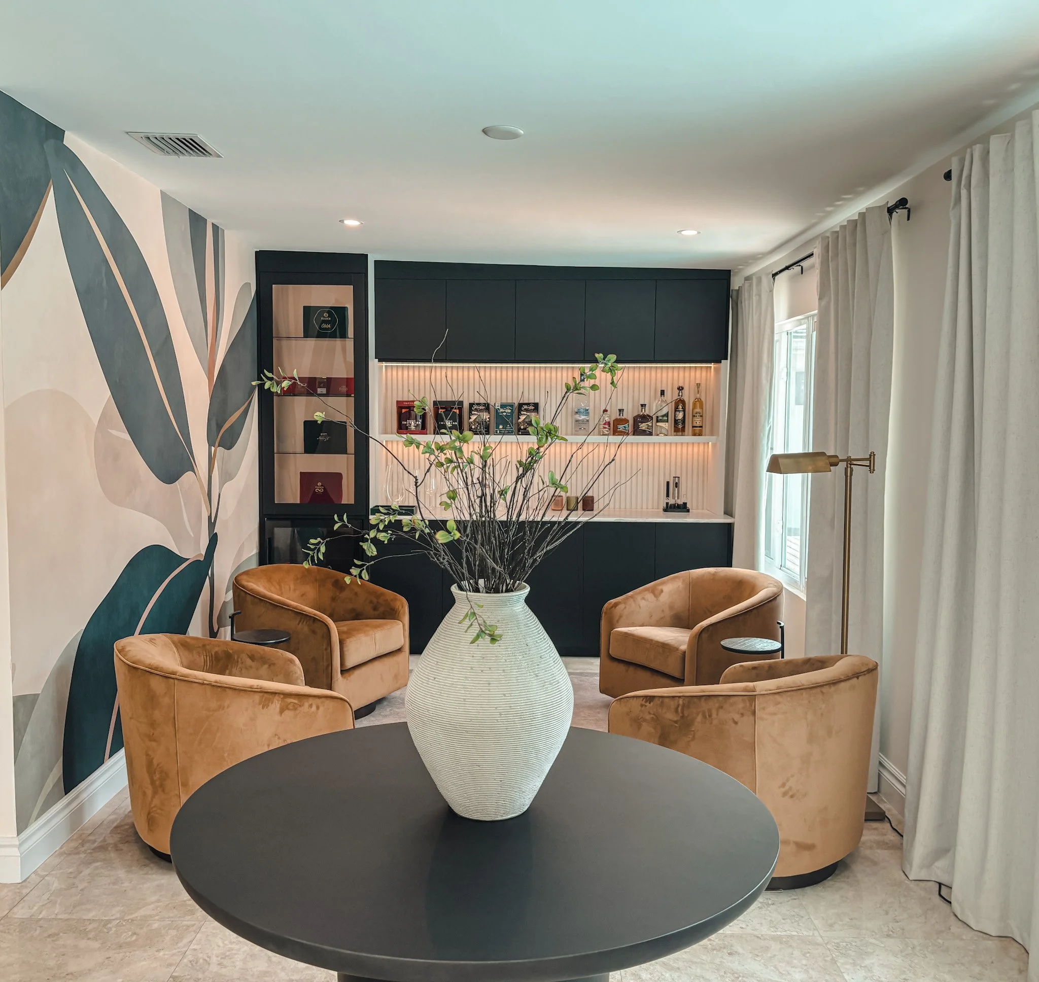 Curated cigar lounge corner — elegance, warm textures, and refined ambiance within a private residence
